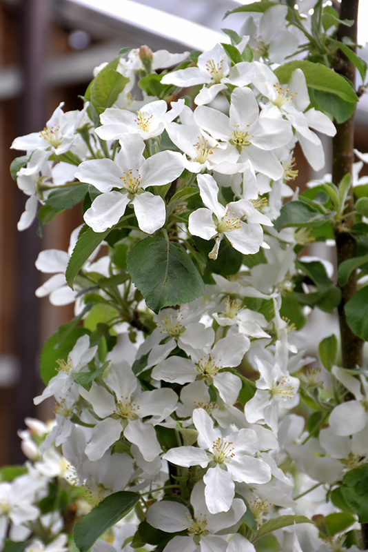 Honeycrisp Apple features showy clusters of lightly-scented white flowers with shell pink overtones along the branches in mid spring, which emerge from distinctive pink flower buds. It has forest green deciduous foliage. The pointy leaves turn yellow in fall. The fruits are showy red apples carried in abundance from early to mid fall. The fruit can be messy if allowed to drop on the lawn or walkways, and may require occasional clean-up.