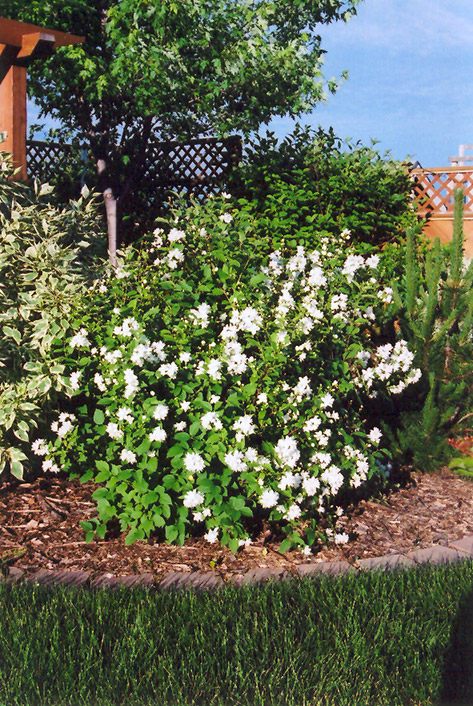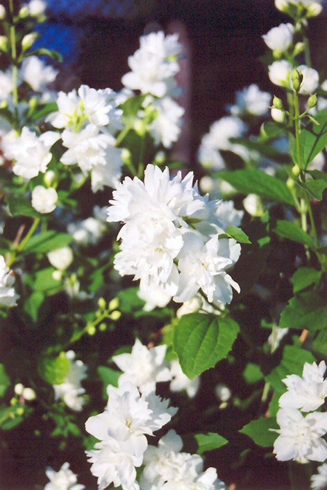 Buckley's Quill Mockorange is clothed in stunning clusters of fragrant double white pincushion flowers at the ends of the branches in late spring. It has green deciduous foliage. The serrated oval leaves do not develop any appreciable fall color.