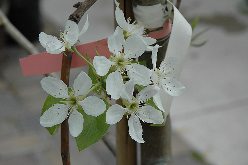 Bosc Pear is clothed in stunning clusters of white flowers with purple anthers along the branches in early spring. It has forest green deciduous foliage. The glossy pointy leaves turn an outstanding deep purple in the fall. The fruits are showy yellow pears with brown overtones, which are carried in abundance from late summer to early fall. The fruit can be messy if allowed to drop on the lawn or walkways, and may require occasional clean-up.
