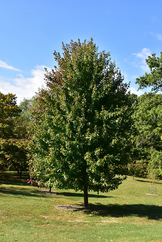 A popular hybrid of the silver and red maples with good branching and a consistent upright oval shape; fall coloration is rather distinctive, with red patches appearing among green leaves, eventually with a mix of yellow, red and orange; very fast grower