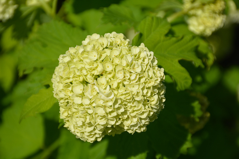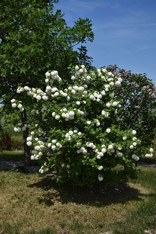 Snowball Viburnum features showy balls of white flowers at the ends of the branches in late spring. It has dark green deciduous foliage. The large serrated lobed leaves turn an outstanding deep purple in the fall. The smooth gray bark and gold branches add an interesting dimension to the landscape.