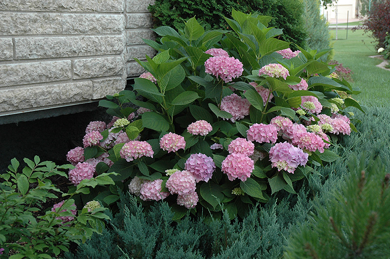 An absolute breakthrough for this much-desired species, this spectacular summer-bloomer is not only very hardy, but it blooms on both old and new wood; enormous deep pink globe-shaped flowers turn blue in acidic soil, somewhat coarse leaves