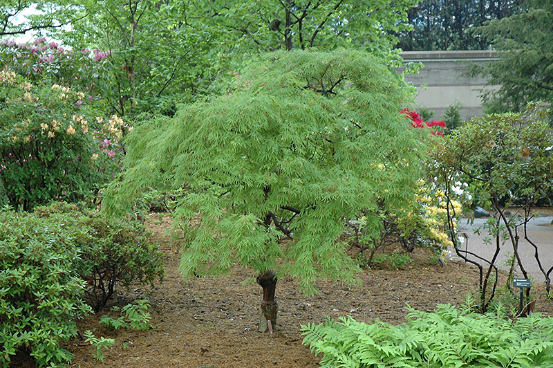Cutleaf Japanese Maple is primarily valued in the landscape or garden for its cascading habit of growth. It has attractive green deciduous foliage. The small deeply cut ferny palmate leaves are highly ornamental and turn outstanding shades of orange, scarlet and crimson in the fall.