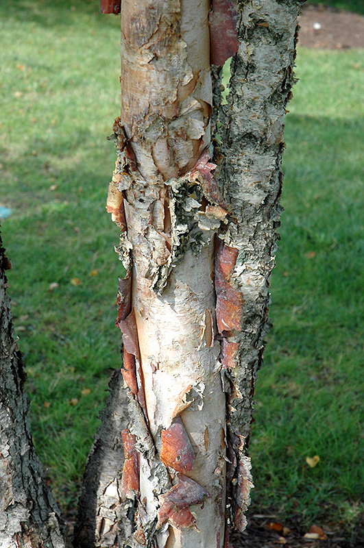 A multi-trunked form of the native river birch selected for its amazing peeling bark in colors of white, brown and tan, more creamy white than the species, also has reliable fall color; needs acidic soil, susceptible to chlorosis in alkaline soils