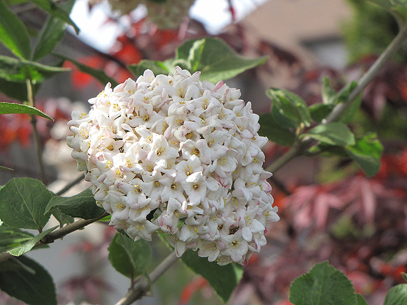 Cayuga Fragrant Viburnum (tree form) features showy balls of fragrant white flowers at the ends of the branches from mid spring to early summer, which emerge from distinctive pink flower buds before the leaves. It has dark green deciduous foliage. The round leaves turn an outstanding deep purple in the fall. The black fruits are held in clusters from late summer to late winter.