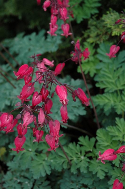 Amore Rose Bleeding Heart features delicate nodding rose heart-shaped flowers dangling from the stems from mid spring to late summer, which emerge from distinctive red flower buds. Its ferny compound leaves remain bluish-green in color throughout the season. The burgundy stems can be quite attractive.
