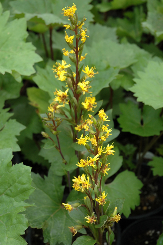 Bottle Rocket Rayflower features bold spikes of yellow flowers rising above the foliage from mid to late summer. Its large serrated heart-shaped leaves remain dark green in color throughout the season. The deep purple stems are very colorful and add to the overall interest of the plant.