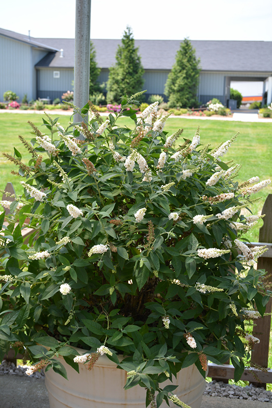 Miss Pearl Butterfly Bush makes a fine choice for the outdoor landscape, but it is also well-suited for use in outdoor pots and containers. With its upright habit of growth, it is best suited for use as a 'thriller' in the 'spiller-thriller-filler' container combination; plant it near the center of the pot, surrounded by smaller plants and those that spill over the edges. It is even sizeable enough that it can be grown alone in a suitable container. Note that when grown in a container, it may not perform exactly as indicated on the tag - this is to be expected. Also note that when growing plants in outdoor containers and baskets, they may require more frequent waterings than they would in the yard or garden.