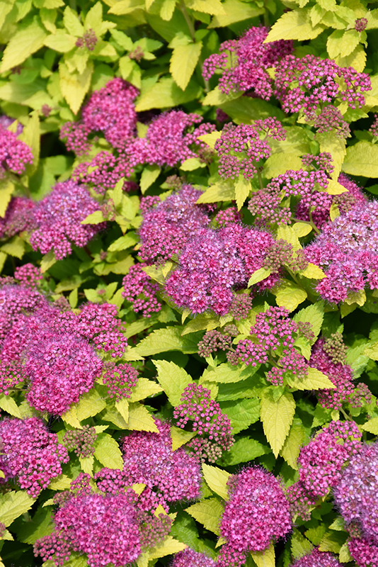 Double Play® Gold Spirea features showy clusters of hot pink flowers at the ends of the branches from late spring to early summer, which emerge from distinctive brick red flower buds. It has attractive gold foliage with hints of chartreuse which emerges yellow in spring. The small serrated pointy leaves are highly ornamental and turn an outstanding coppery-bronze in the fall.