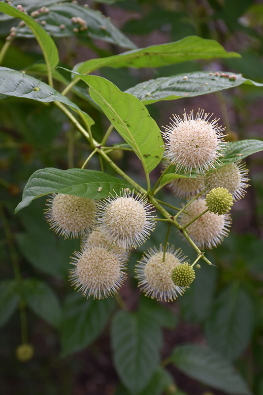 An interesting native shrub with most unusual flowers, hundreds of tiny tubular flowers packed into a ball; a great conversation piece when in bloom; fruit persists into winter and add interest; an excellent choice for very wet sites