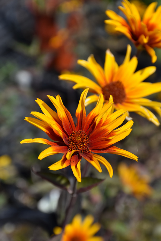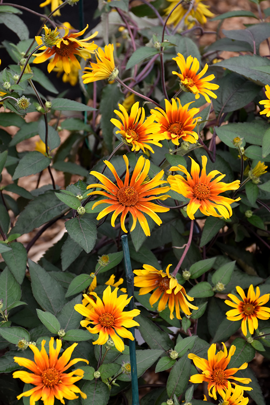 Burning Hearts False Sunflower has masses of beautiful gold daisy flowers with coppery-bronze eyes and a tomato-orange ring at the ends of the stems from early summer to mid fall, which are most effective when planted in groupings. The flowers are excellent for cutting. Its serrated oval leaves emerge green in spring, turning dark green in color with showy deep purple variegation throughout the season. The deep purple stems can be quite attractive.