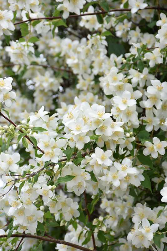Blizzard Mockorange is covered in stunning clusters of fragrant white flowers with yellow eyes at the ends of the branches in late spring. It has green deciduous foliage. The serrated oval leaves do not develop any appreciable fall color.