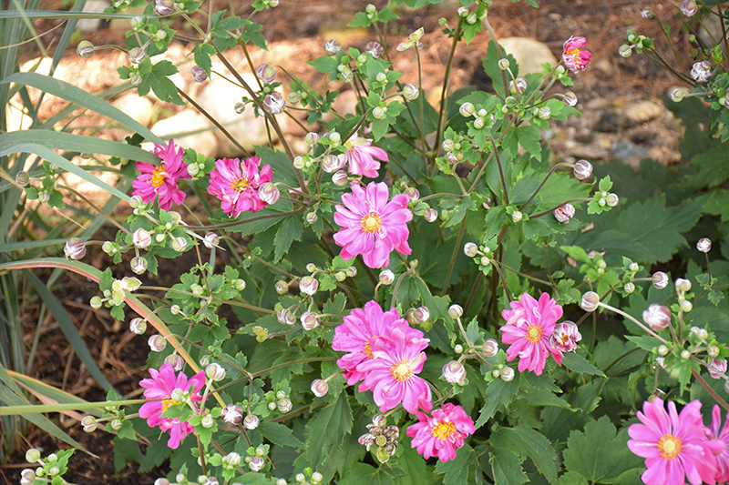 Fall In Love™ Sweetly Anemone will grow to be about 20 inches tall at maturity, with a spread of 28 inches. When grown in masses or used as a bedding plant, individual plants should be spaced approximately 24 inches apart. Its foliage tends to remain dense right to the ground, not requiring facer plants in front. It grows at a medium rate, and under ideal conditions can be expected to live for approximately 10 years. As an herbaceous perennial, this plant will usually die back to the crown each winter, and will regrow from the base each spring. Be careful not to disturb the crown in late winter when it may not be readily seen! As this plant tends to go dormant in summer, it is best interplanted with late-season bloomers to hide the dying foliage.