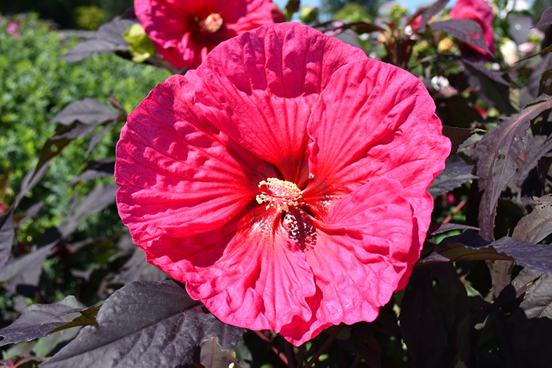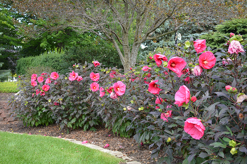 A beautiful and bold garden perennial featuring very showy hot pink flowers with crimson eyes, over contrasting, near black foliage; ideal for the mixed garden border or in mass; do not allow to dry to the point of wilting