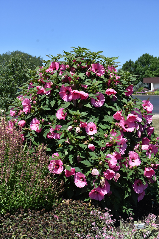This bold garden perennial features large, ruffled, bubblegum pink flowers with near-black, dark red eyes; upright, columnar habit with bright green leaves; ideal for the mixed garden border or in mass; do not allow to dry to wilting point