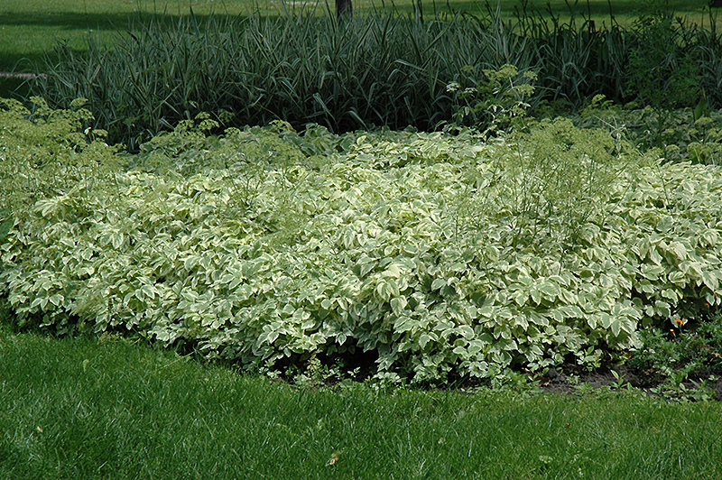Variegated Bishop's Goutweed's attractive compound leaves remain green in color with showy white variegation throughout the season on a plant with a spreading habit of growth.
