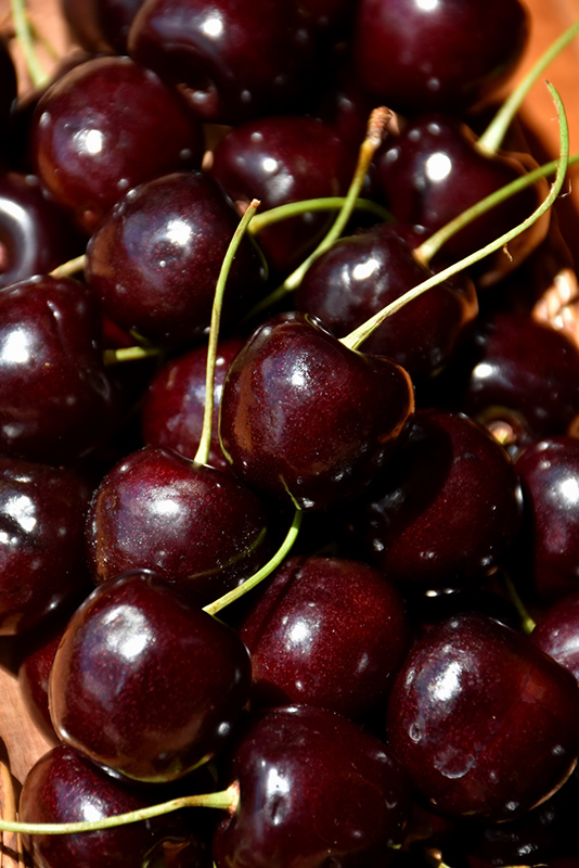 Lapins Cherry is a large shrub that is typically grown for its edible qualities. It produces red round fruit (technically 'drupes') with dark red flesh which are usually ready for picking in early summer. The fruit will often fade to black over time. Note that the fruits have hard inedible pits inside which must be removed before eating or processing. The fruits have a sweet taste and a juicy texture.