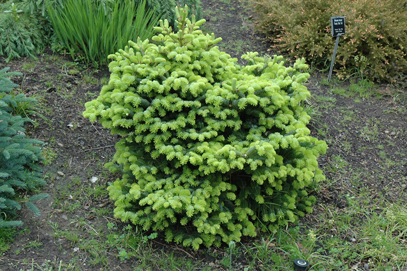 An outstanding, slow growing selection that is very compact, with an irregular, mounding habit; fine foliage emerges light yellow-green, maturing to blue-green with silver highlights; particular about growing conditions, not for hot, dry or windy sites