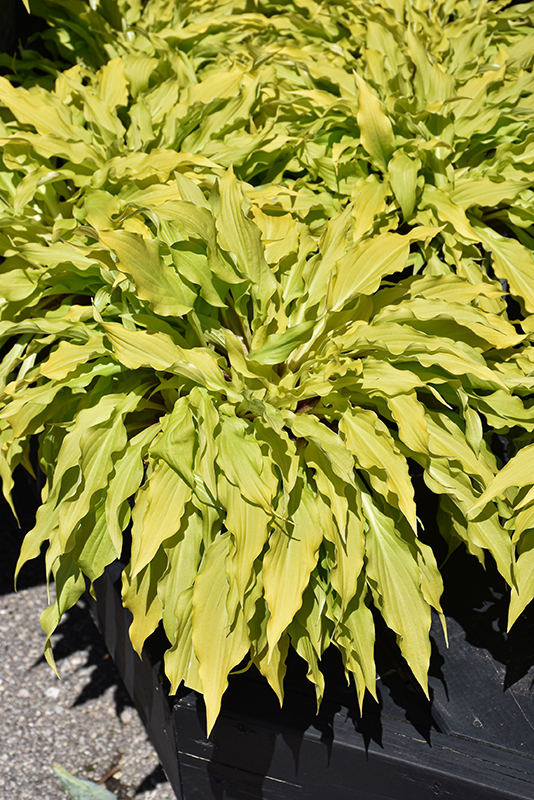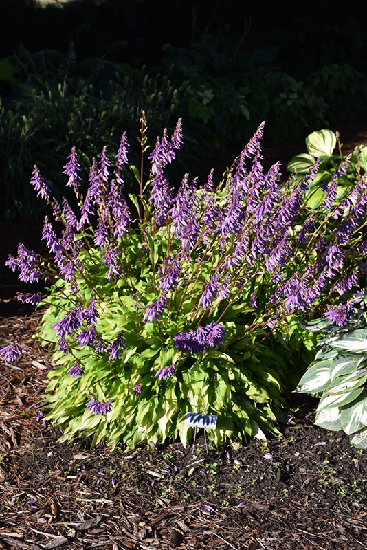 This interesting variety features narrow, moderately wavy yellow leaves that become more chartreuse as summer progresses; long lasting, deep purple flowers contrast the foliage in late summer; great texture and contrast for shade gardens
