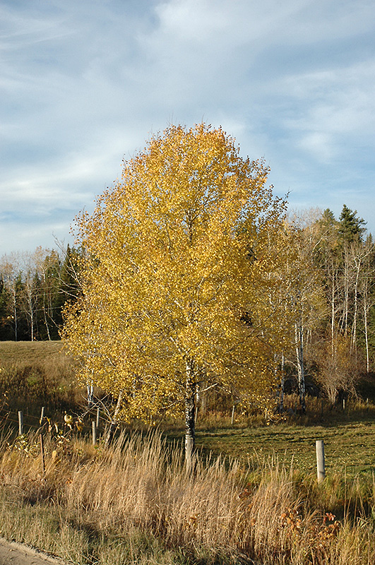 Trembling Aspen has rich green deciduous foliage on a tree with an oval habit of growth. The round leaves turn an outstanding gold in the fall. However, the fruit can be messy in the landscape and may require occasional clean-up. The smooth white bark adds an interesting dimension to the landscape.