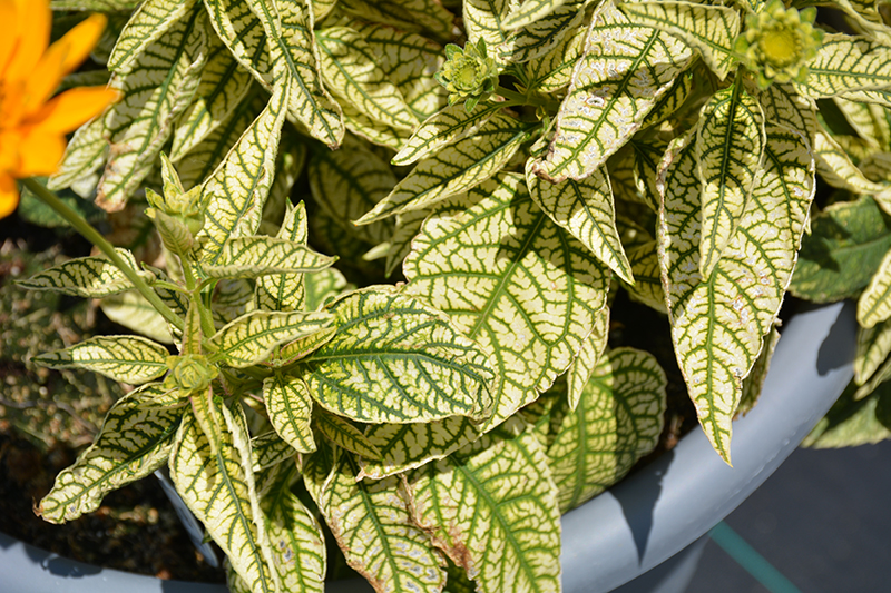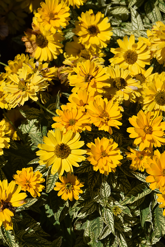 Bit Of Honey False Sunflower has masses of beautiful semi-double gold daisy flowers with yellow overtones and coppery-bronze eyes at the ends of the stems from mid to late summer, which are most effective when planted in groupings. The flowers are excellent for cutting. Its attractive serrated pointy leaves remain creamy white in color with distinctive dark green veins throughout the season.