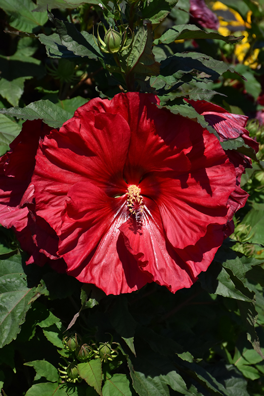 Summerific® Valentine's Crush Hibiscus features bold cherry red round flowers along the stems from mid to late summer. Its attractive pointy leaves emerge coppery-bronze in spring, turning green in color with hints of coppery-bronze throughout the season.