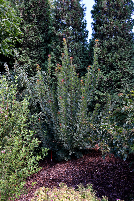 The Velvet Fog® Smokebush features airy panicles of pink flowers with red overtones at the ends of the branches from early to mid summer. It has attractive bluish-green foliage with light green undersides which emerges red in spring. The oval leaves are highly ornamental and turn outstanding shades of burgundy and in the fall.