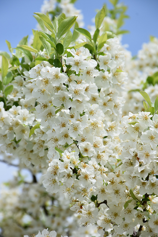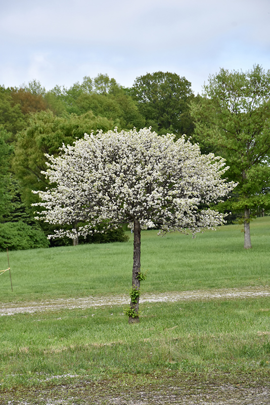 Here's an accent tree quite unlike anything you've ever seen before; a dense bushy globular head is grafted onto a standard, maintains its rounded form with minimal pruning; absolutely smothered in white flowers in spring, showy red fruit in fall