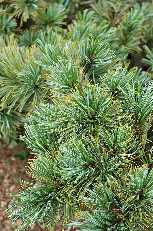 An exceptional compact spreading pine that trails along the ground yet has an upright branching character; distinctive needles have prominent silver stripes for an overall blue effect from a distance; worthy of much greater use