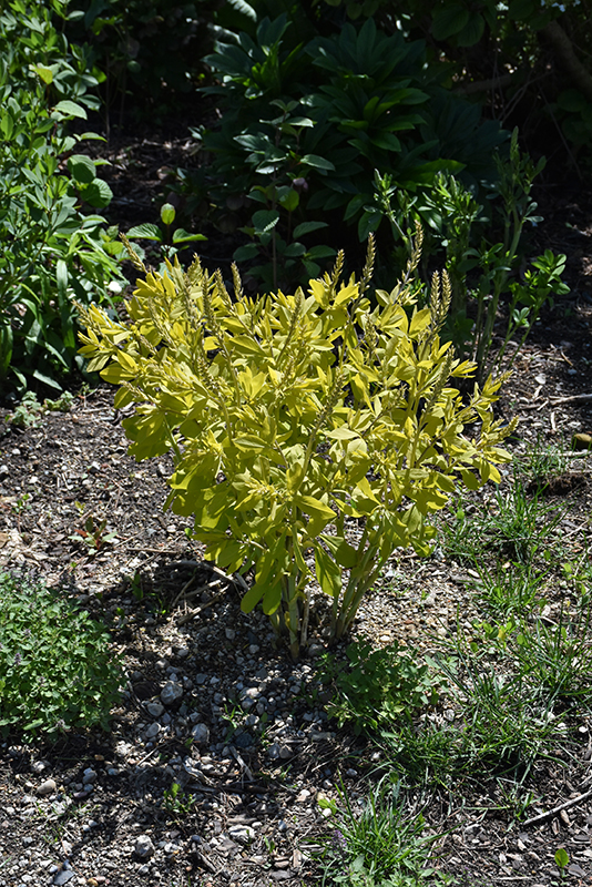 Golden Anniversary False Indigo will grow to be about 30 inches tall at maturity, with a spread of 3 feet. It tends to be leggy, with a typical clearance of 1 foot from the ground, and should be underplanted with lower-growing perennials. It grows at a slow rate, and under ideal conditions can be expected to live for approximately 25 years. As an herbaceous perennial, this plant will usually die back to the crown each winter, and will regrow from the base each spring. Be careful not to disturb the crown in late winter when it may not be readily seen!