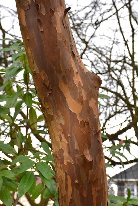 Japanese Stewartia features delicate white flowers with orange anthers along the branches in mid summer. It has forest green deciduous foliage. The pointy leaves turn an outstanding red in the fall. The mottled khaki (brownish-green) bark is extremely showy and adds significant winter interest.