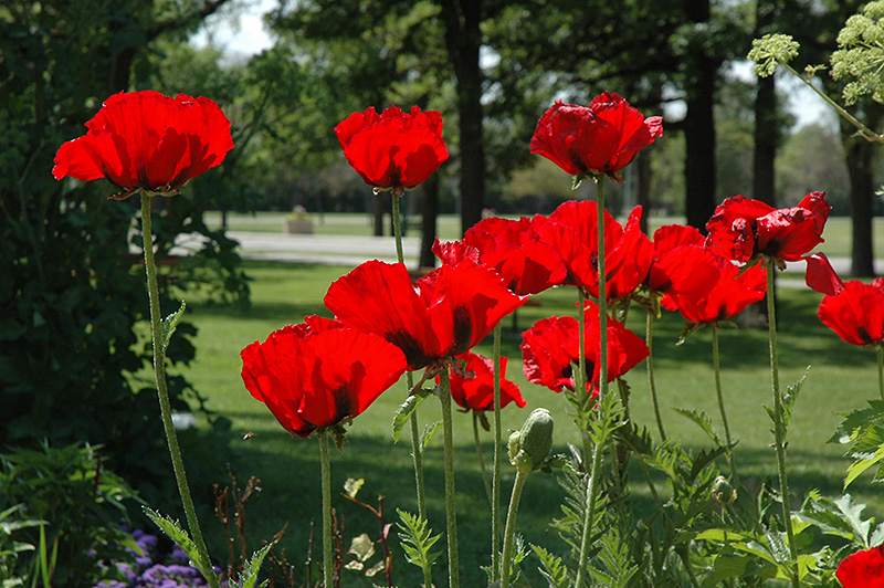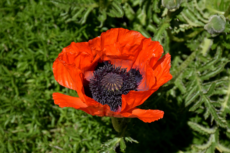Beauty of Livermere Poppy features bold red round flowers with burgundy eyes and black centers at the ends of the stems from early to mid summer. The flowers are excellent for cutting. Its deeply cut ferny leaves remain forest green in color throughout the season.