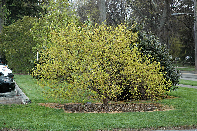 A choice small specimen tree for landscape use; features golden-yellow foliage, bright yellow flowers in very early spring before the leaves and red berries in summer, neat habit of growth, but some suckering