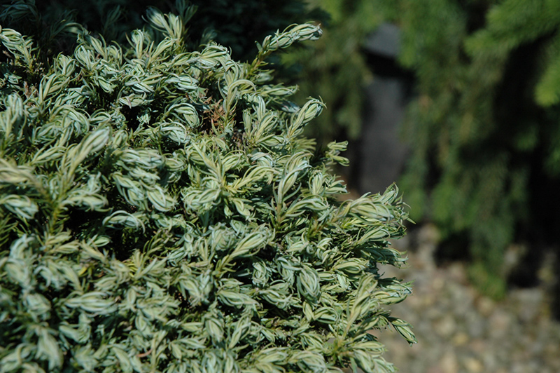 Cyano-Viridis Poodle Form Falsecypress is a dwarf conifer which is primarily valued in the landscape or garden for its highly ornamental lollipop-like shape. It has attractive steel blue foliage with silver stripes. The scale-like sprays of foliage are highly ornamental and remain steel blue throughout the winter. The shaggy antique red bark adds an interesting dimension to the landscape.