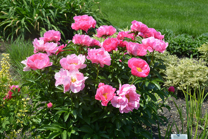 Paula Fay Peony features bold lightly-scented semi-double pink flowers with yellow centers at the ends of the stems in early summer. The flowers are excellent for cutting. Its compound leaves remain green in color throughout the season.