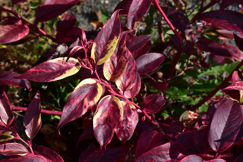 Amazing green and cream splashed leaves tinted with burgundy; a compact shrub with pretty clusters of urn-shaped white flowers that compliment the interesting foliage; arching stems have a zigzag pattern; best in part-shade; water in extreme heat